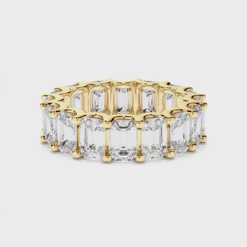 This stunning custom-made eternity ring features a full band of emerald cut diamonds set on an 18ct gold or platinum band. Exuding fluidity in its line work, and boasting an elegant silhouette, as with all the pieces in our Bespoke Collection, this piece is made especially for you.