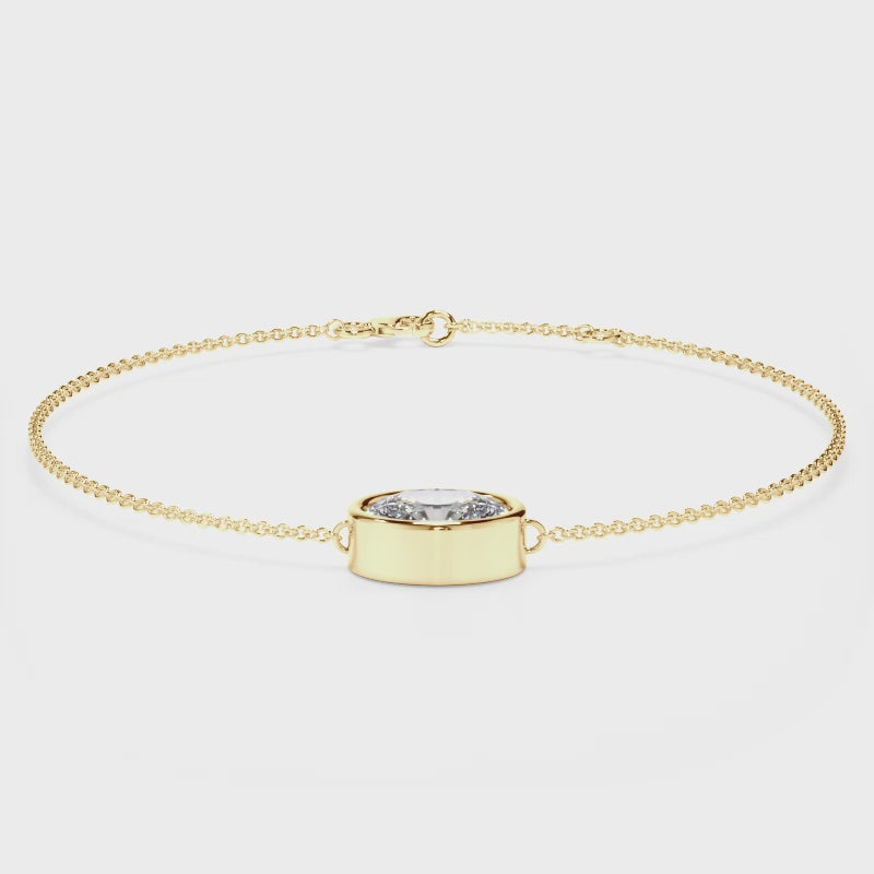 This timeless bezel set diamond bracelet, made with your choice of diamond centre stone, features a 1.00ct oval cut laboratory-grown diamond set in 18ct gold. Exuding fluidity in its line work, and boasting an elegant silhouette, as with all the pieces in our Bespoke Collection, this piece is made especially for you.