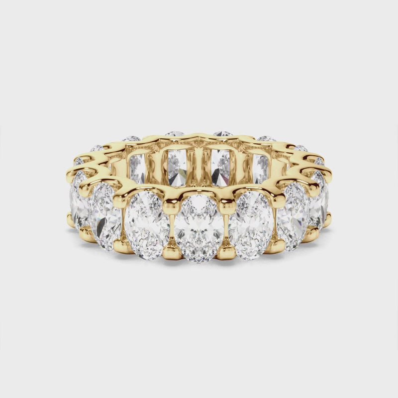 This stunning custom-made eternity ring features a full band of oval cut diamonds set on an 18ct gold band. Exuding fluidity in its line work, and boasting an elegant silhouette, as with all the pieces in our Bespoke Collection, this piece is made especially for you.