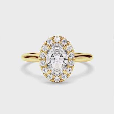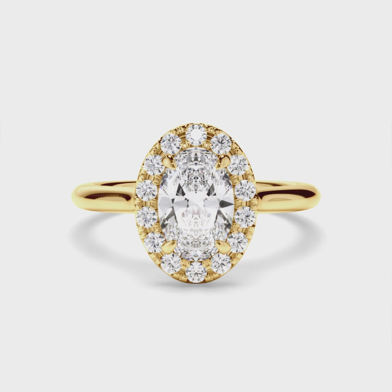 Made with your choice of diamond centre stone, this timeless custom-made engagement ring features an oval cut diamond centre stone with a halo of diamonds. Exuding fluidity in its line work, and boasting an elegant silhouette, as with all the pieces in our Bespoke Collection, this piece is made especially for you.