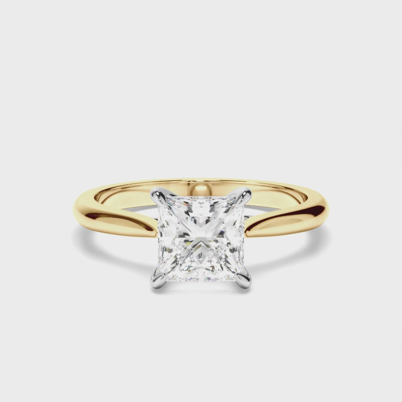 This timeless custom-made solitaire engagement ring, made with your choice of diamond centre stone, features a princess cut diamond and a half round band. Exuding fluidity in its line work, and boasting an elegant silhouette, as with all the pieces in our Bespoke Collection, this piece is made especially for you.